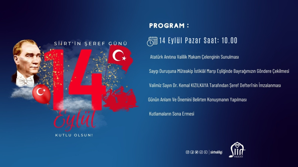 Cumhuriyetimizin kurucusu Gazi Mustafa Kemal Atatürk'ün Siirt'e teşriflerinin 109. yıl dönümü, 14 Eylül pazar günü düzenlenecek törenle kutlanacak