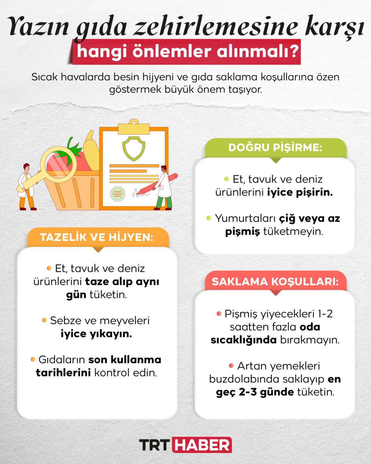 “Özellikle et, tavuk ve deniz ürünlerini taze alıp tüketmek, sebze ve meyvelerin iyice yıkandığından emin olmak ve tüm gıdaların son kullanım tarihlerini kontrol etmek şart. Bunun dışında et, tavuk ve deniz ürünlerini iyice pişirerek tüketmek, yumurtayı çiğ veya az pişmiş şekilde yememek de önemli. Pişmiş yiyecekleri 1-2 saatten fazla oda sıcaklığından bırakmamak, artan yemekleri buzdolabında saklayıp en geç 2-3 günde tüketmek unutulmaması gereken bir başka kural.”