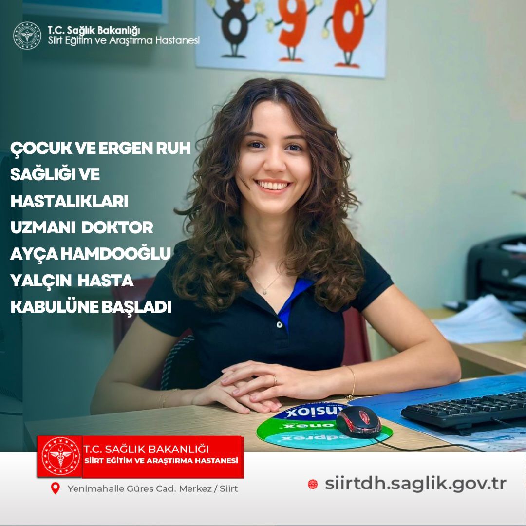124.Dönem Devlet Hizmeti Yükümlülüğü kapsamında Siirt Eğitim ve Araştırma Hastanesi’ne atanan Çocuk ve Ergen Ruh Sağlığı ve Hastalıkları Uzmanı Dr. Ayça Hamdooğlu Yalçın, hasta kabulüne başlamıştır.