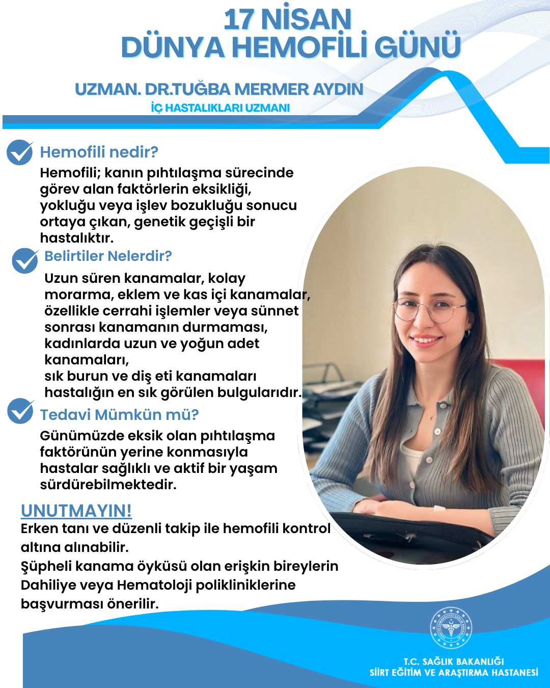 Siirt Eğitim ve Araştırma Hastanesi İç Hastalıkları Uzmanı Tuğba Mermer Aydın’dan 17 Nisan Dünya Hemofili Günü Mesajı